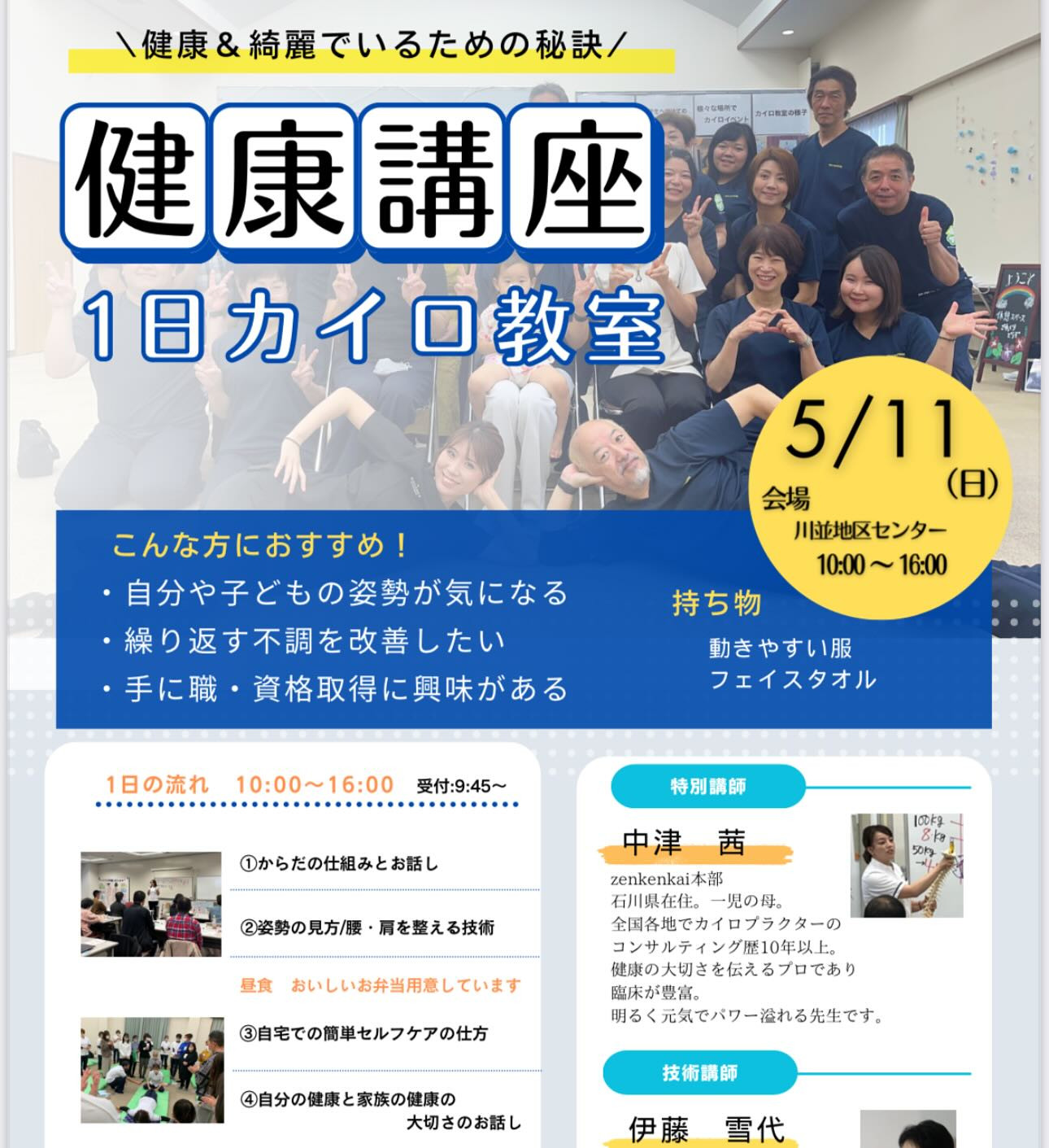 皆様、こんにちは!体調はいかがでしょうか?🌿心も体もすっきりと過ごしたいですよね。そこで、5月11日に健康講座を開催します✨カイロプラクティックについてもっと知りたい方、ぜひお越しください!👩⚕️ここで生活の質を向上させるヒントをゲットして、毎日をもっとアクティブに楽しみましょう💪お友達やご家族も誘って、楽しい時間を一緒に過ごしましょうね🌟