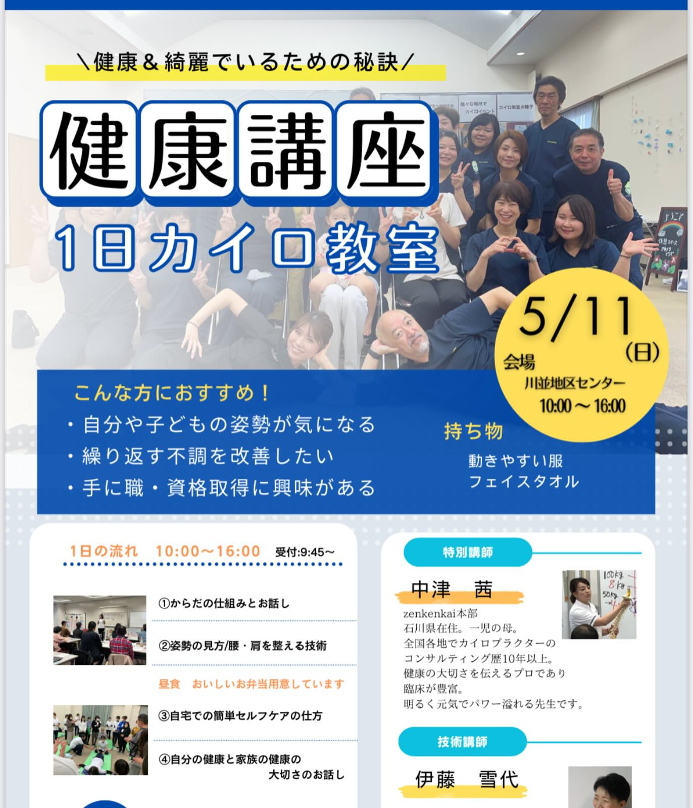 皆様、こんにちは!体調はいかがでしょうか?🌿心も体もすっきりと過ごしたいですよね。そこで、5月11日に健康講座を開催します✨カイロプラクティックについてもっと知りたい方、ぜひお越しください!👩⚕️ここで生活の質を向上させるヒントをゲットして、毎日をもっとアクティブに楽しみましょう💪お友達やご家族も誘って、楽しい時間を一緒に過ごしましょうね🌟